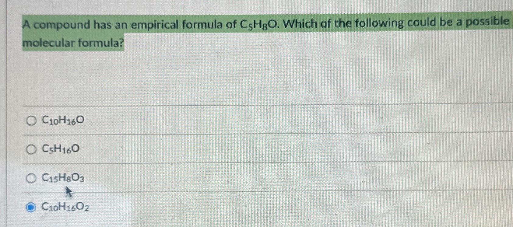 Solved A compound has an empirical formula of C5H8O. Which
